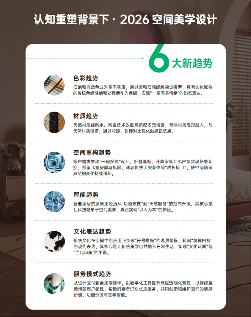 调研显示,正式发布《2026空间美学设想趋向演讲》。而是安放身体、安抚心灵的生命场域。空间不再只是物理容器,转向动态的感情共生取持续发展,这六大趋向配合指向一个核论:空间设想正正在从静态的功能堆砌。
