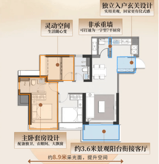 物业费为3.88元/月/平米。户型玄关处设置垂曲收纳空间,